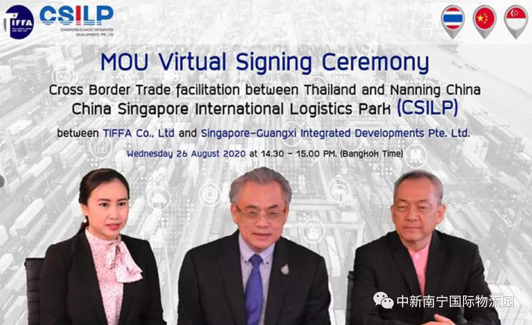 2020年8月26日,廣西新中產(chǎn)業(yè)投資有限公司董事長張松聲與泰國國際貨運代理協(xié)會有限公司(TIFFA Co.,LTD,以下簡稱TIFFA)主席Suwit Ratanachinda正式簽訂雙方合作諒解備忘錄(MOU),因疫情影響簽訂儀式以線上云簽約的方式進行。