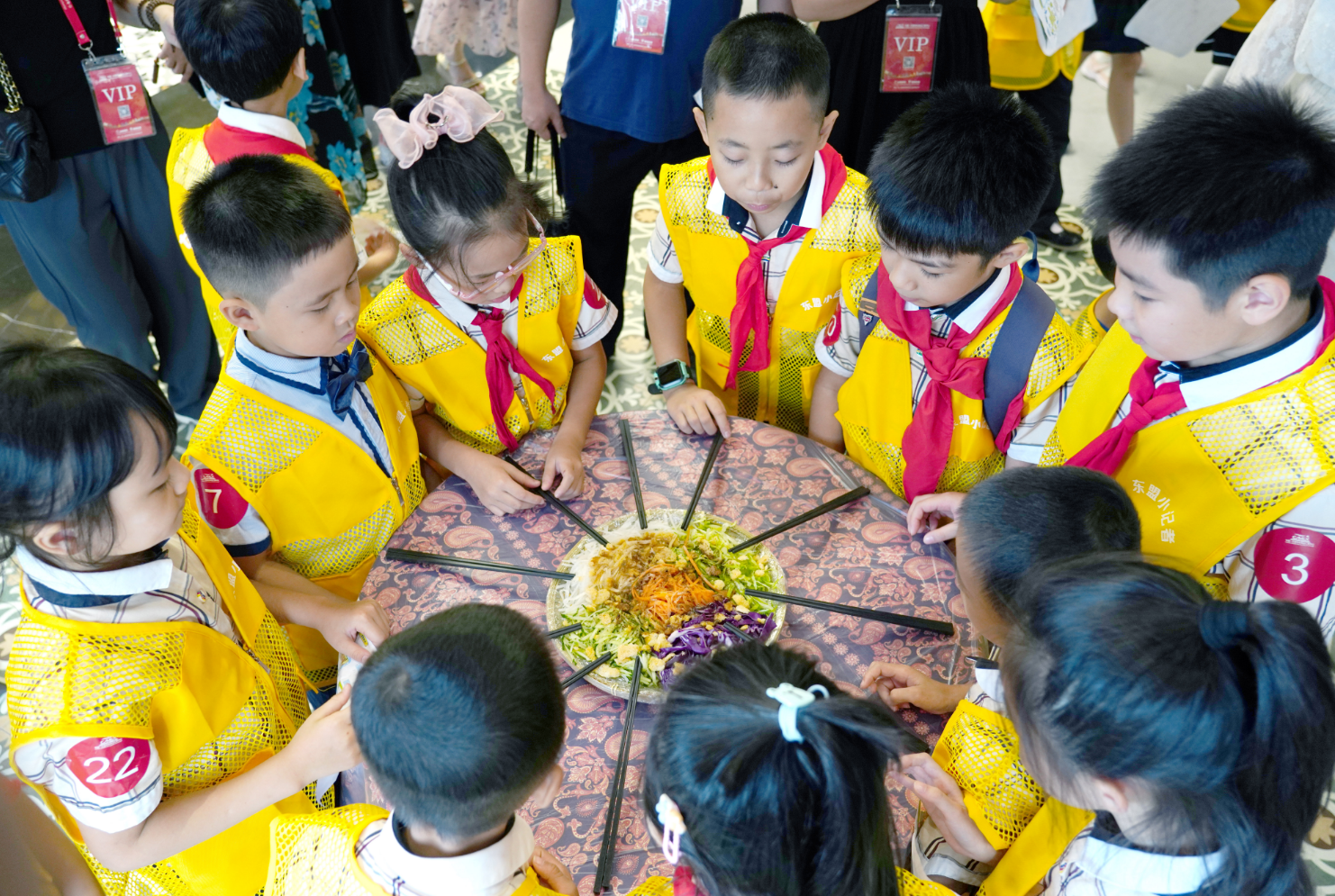 在馬來(lái)西亞館,東盟“小記者”們?cè)诂F(xiàn)場(chǎng)親身體驗(yàn)了地道的東南亞華人傳統(tǒng)習(xí)俗——“撈生”儀式,即把裝在盤(pán)子里的食材用筷子反復(fù)高高夾起,“撈”得越高,寓意越吉祥。通過(guò)趣味“撈生”,寄語(yǔ)孩子們學(xué)習(xí)更上一層樓、德智體美勞全面發(fā)展的美好愿望。