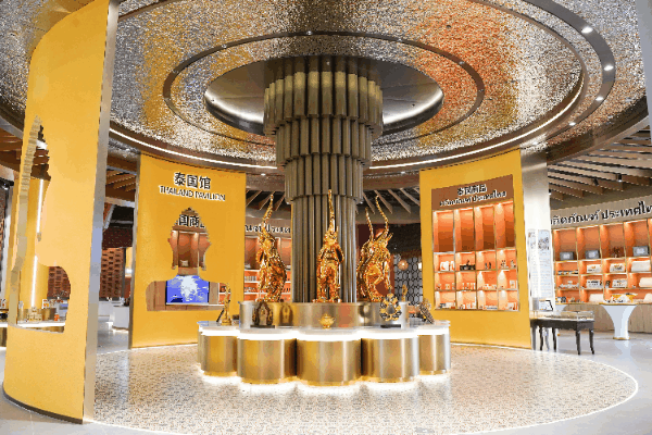 泰國館展示有多種獨具“泰味”的精美藝術(shù)品、特色食品、乳膠制品、化妝品、珠寶飾品、手工藝品等特色商品。