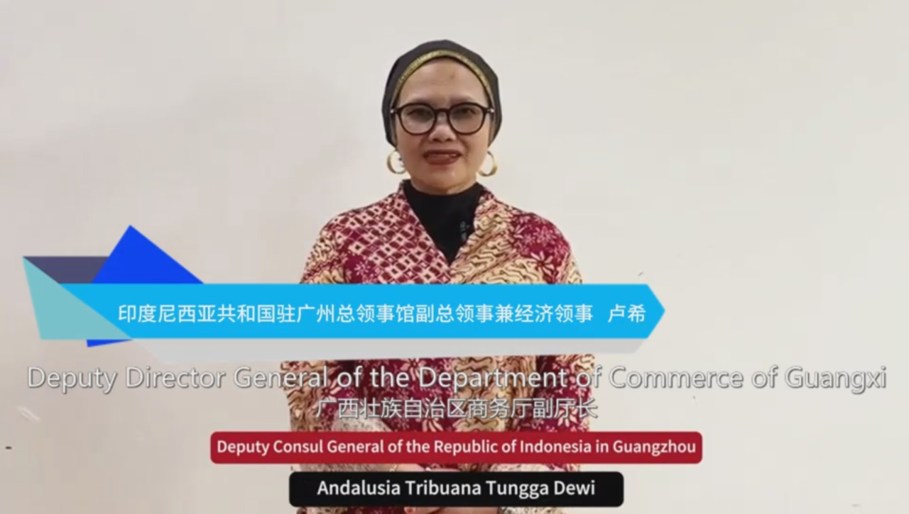 ▲盧希副總領(lǐng)事在視頻致辭中表示,包括廣西在內(nèi)的華南地區(qū)在促進印尼與中國建立更緊密、更深層次關(guān)系方面發(fā)揮著關(guān)鍵作用。清真市場為印尼與廣西之間的合作,包括在東盟框架內(nèi)的合作提供了巨大的機會。今年是印尼和中國建交75周年,中印尼兩國政府致力于進一步加強伙伴關(guān)系。為此,她希望這次活動能夠取得更加具體的成果,造福兩國人民。
