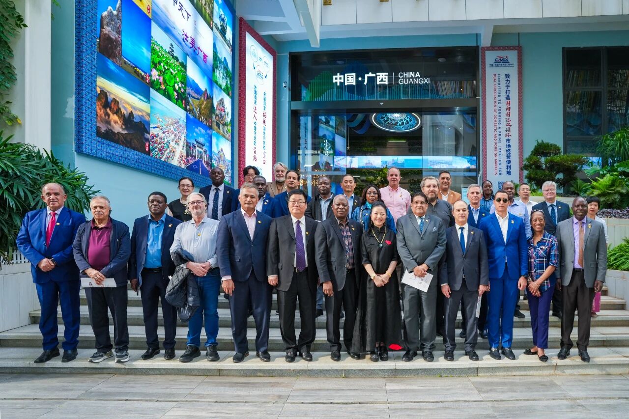八桂大地,金風(fēng)送爽,碩果飄香。 2025年10月28日,來自阿根廷、克羅地亞、喀麥隆、肯尼亞、約旦、哥倫比亞、韓國等國家的駐華大使及外交官齊聚廣西,開啟為期3天的實(shí)地考察之旅,探尋廣西的發(fā)展動(dòng)能與合作空間。在廣西壯族自治區(qū)外事辦公室黨組成員、副主任宋海軍的陪同下,駐華使節(jié)代表團(tuán)首站即走進(jìn)中新南寧國際物流園(簡(jiǎn)稱“中新物流園”)和中國—東盟特色商品匯聚中心(簡(jiǎn)稱“匯聚中心”)。廣西新中產(chǎn)業(yè)投資有限公司、中國—東盟特色商品匯聚中心董事長(zhǎng)趙海燕熱情接待駐華使節(jié)代表團(tuán)。